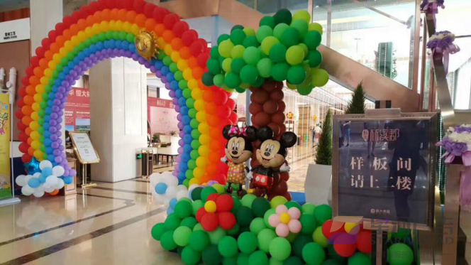 ①售樓處入口異型龍門架包裝。②通往洽談區(qū)的氣球拱門裝飾。③售樓處氣球包柱。