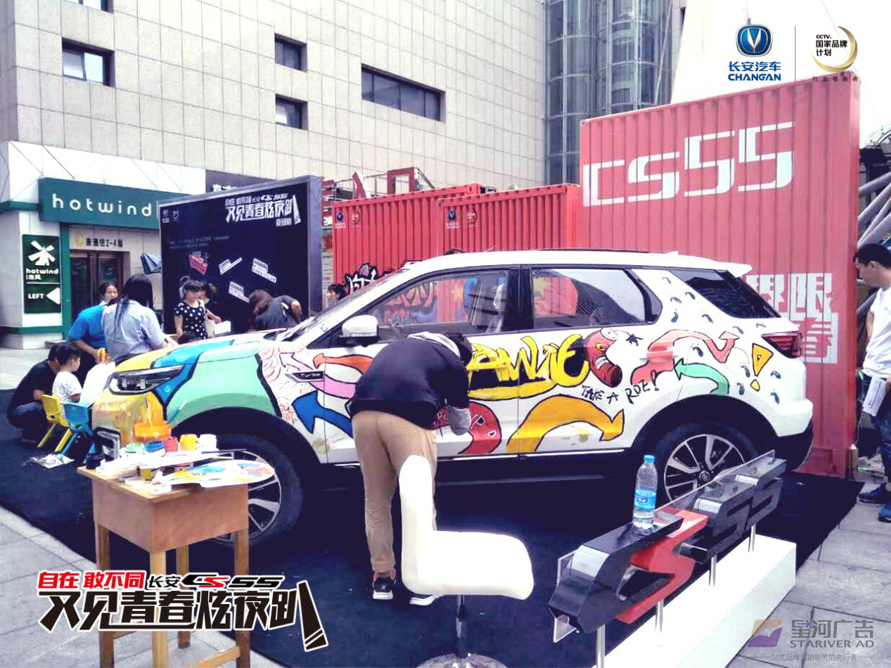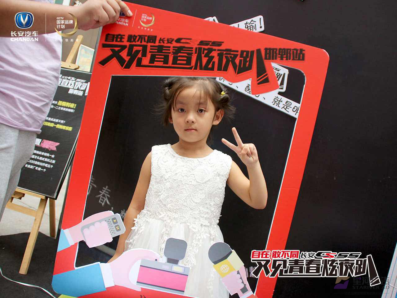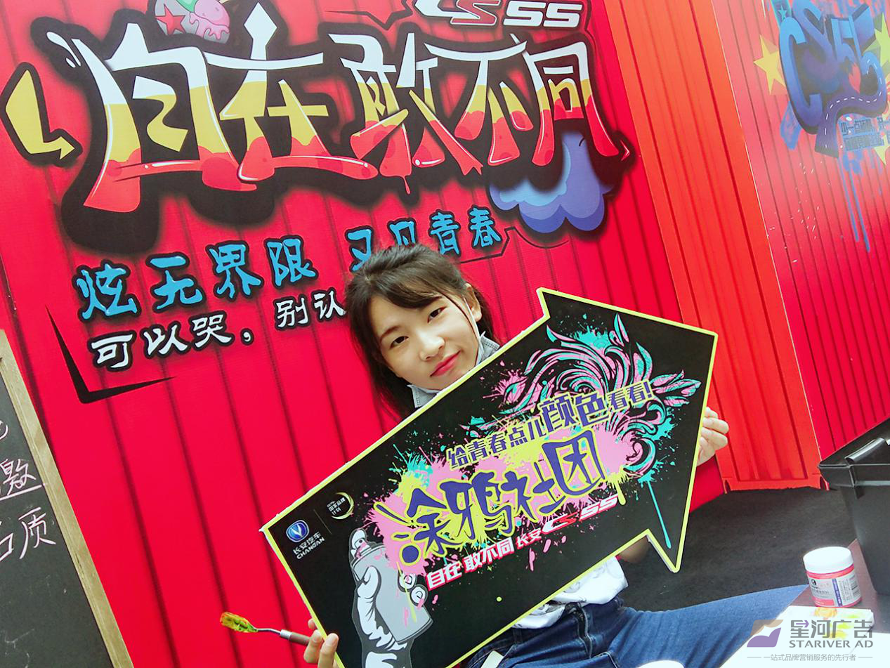 黑板簽到墻、青春合影墻、創(chuàng)意簽到框、個性展車區(qū)、合影立柱、展板、臺卡……場地內(nèi)一切可布置的環(huán)境,都被賦予了CS55的標(biāo)識元素,強化產(chǎn)品名稱認(rèn)知與slogan認(rèn)知,彰顯“新輕年”自在敢不同。