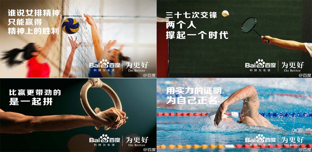 百度: #do better 為更好# 是不是可以理解為“度better 為更好”,當(dāng)然這是一個猜測,語言上的歧義,在展示奧運精神時,暗含百度的品牌理念。