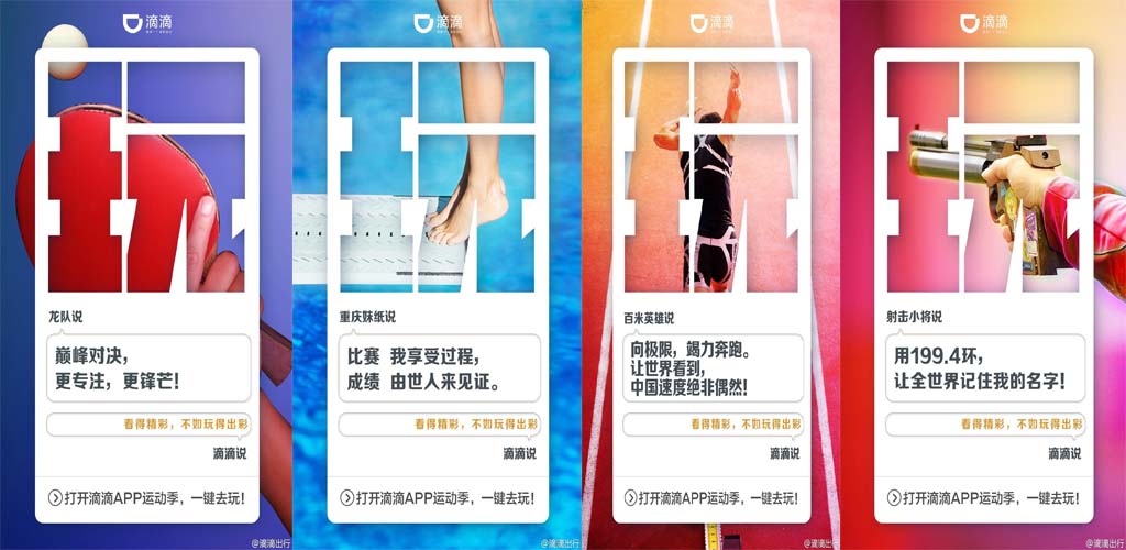 滴滴出行: #玩出冠軍范兒# 體育不僅是用來做競技,也是每個人的用來休閑玩樂的方式,同時契合滴滴APP運動季,一鍵去玩。