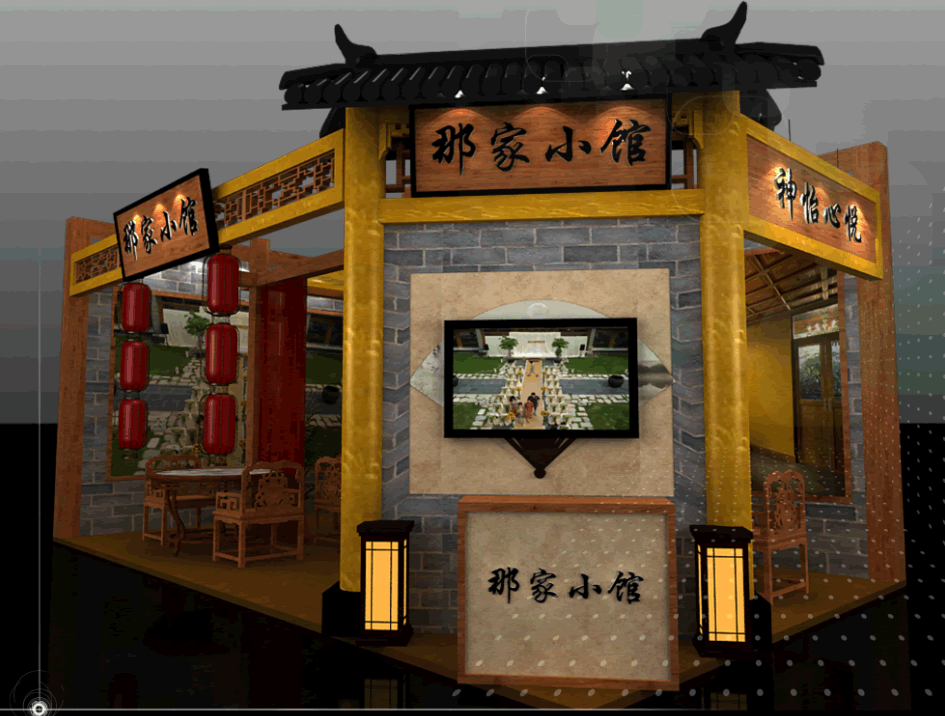 設(shè)計(jì)理念:那家小館是一家宮廷味道的北京菜菜館,結(jié)合菜館本身的裝潢特色保持它自己的特色做出符合菜館調(diào)性的展臺(tái)。讓展臺(tái)在眾多展位里獨(dú)特,顯眼很好的引流到展臺(tái),也起到了很好的宣傳作用。
