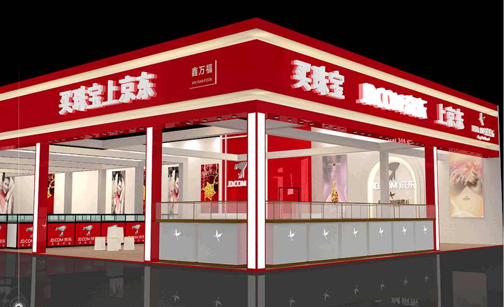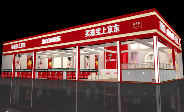 設(shè)計理念:運用京東紅作為展臺的主色調(diào),突出品牌形象,做到宣傳產(chǎn)品,從功能布局上要有足夠的柜臺量來展示要銷售出去的餓珠寶,鑲嵌區(qū),收銀區(qū)和服務(wù)區(qū),休息區(qū),在滿足這些基本要求的基礎(chǔ)上。